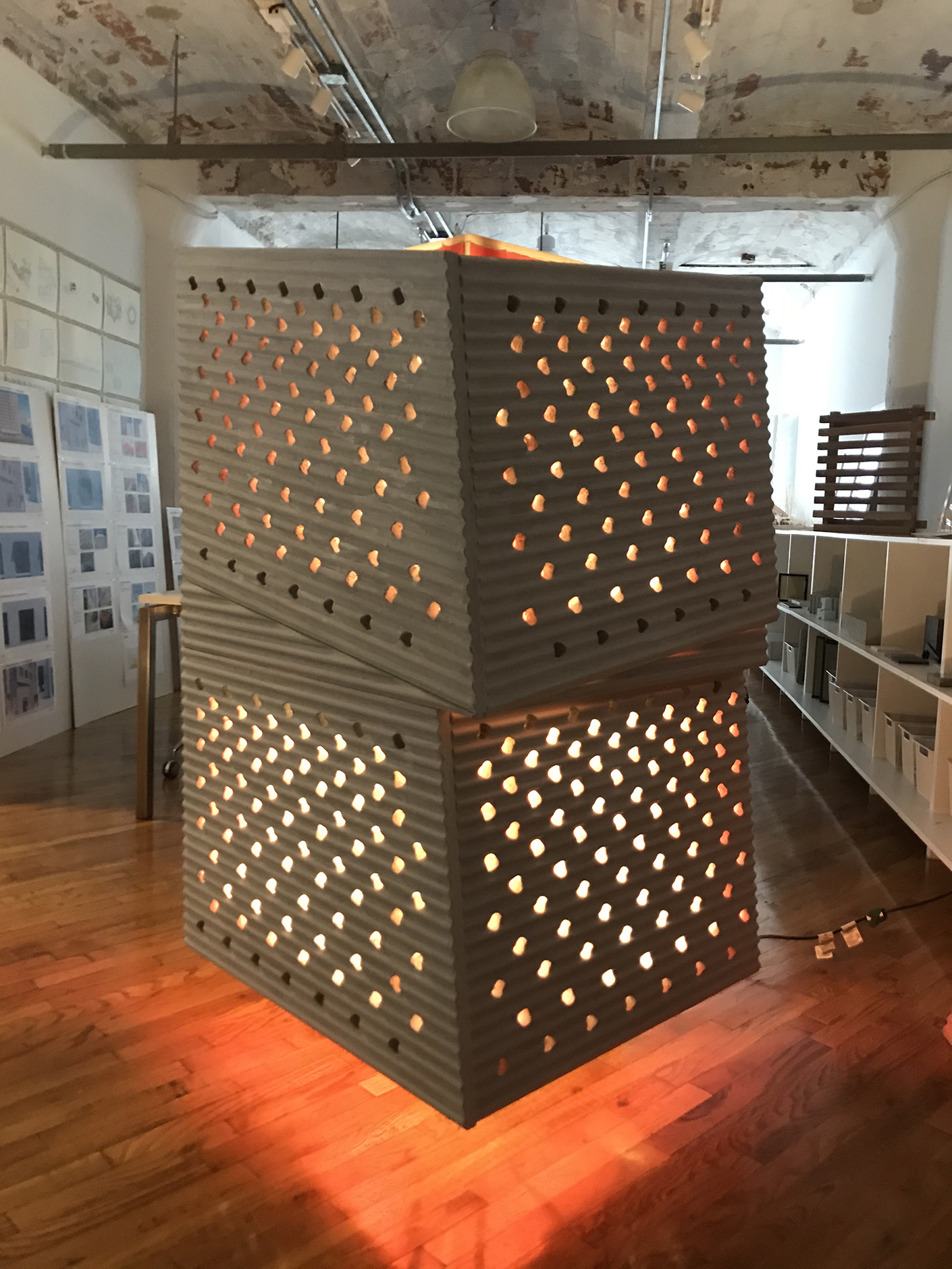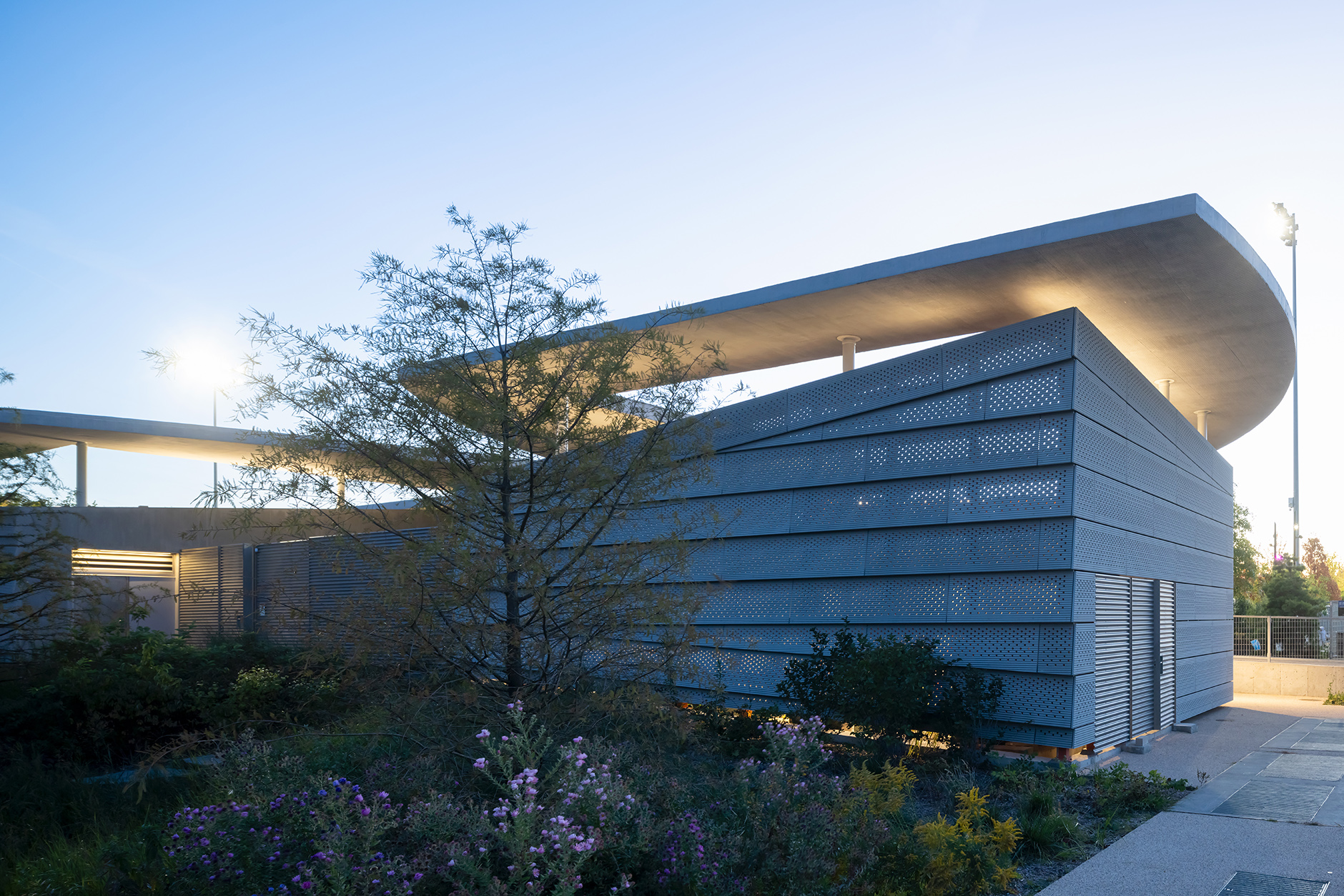 The building’s facade is made of perforated corrugated cast-concrete panels. The backlit panels will produce varying lighting effects as the park transitions from day to night.