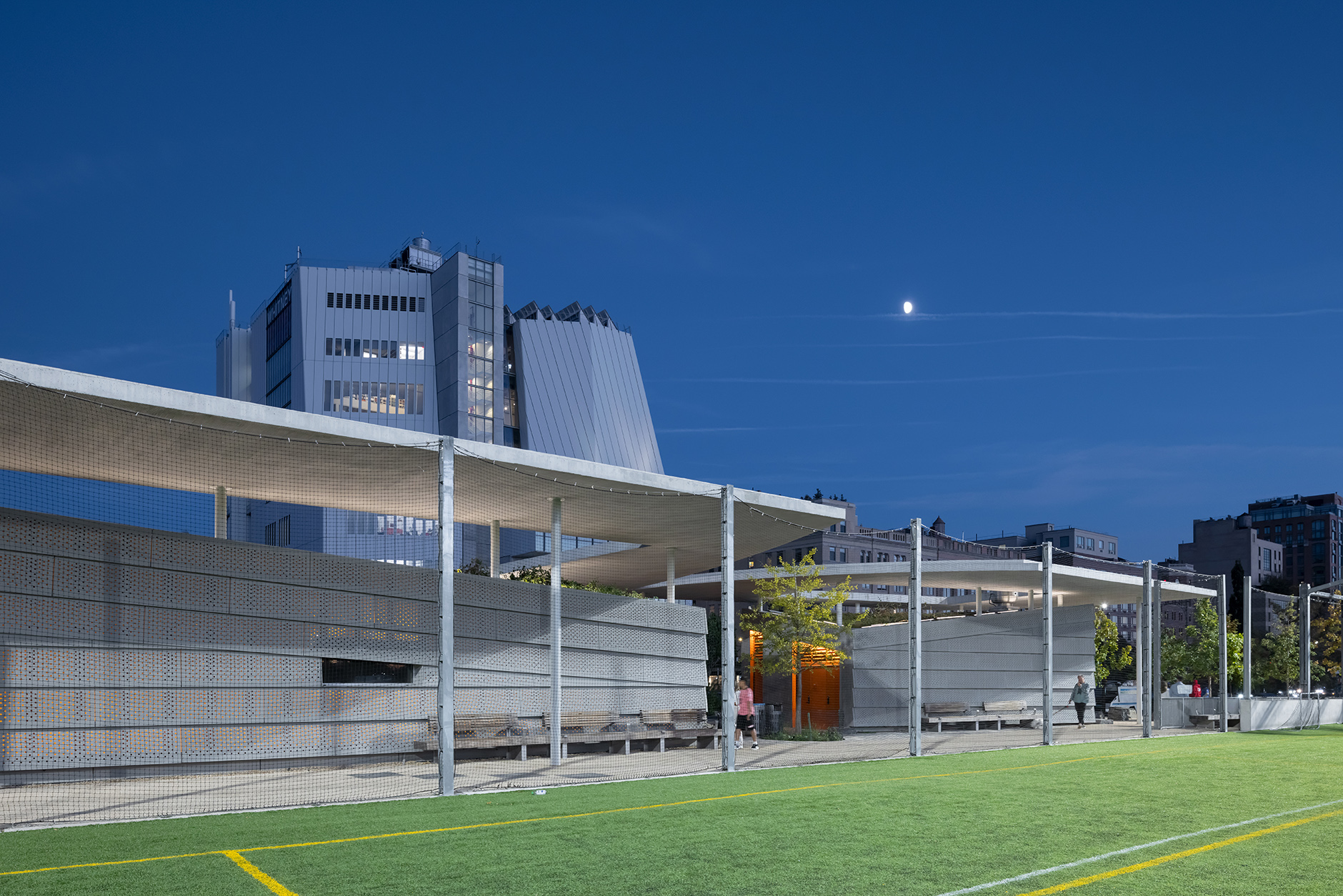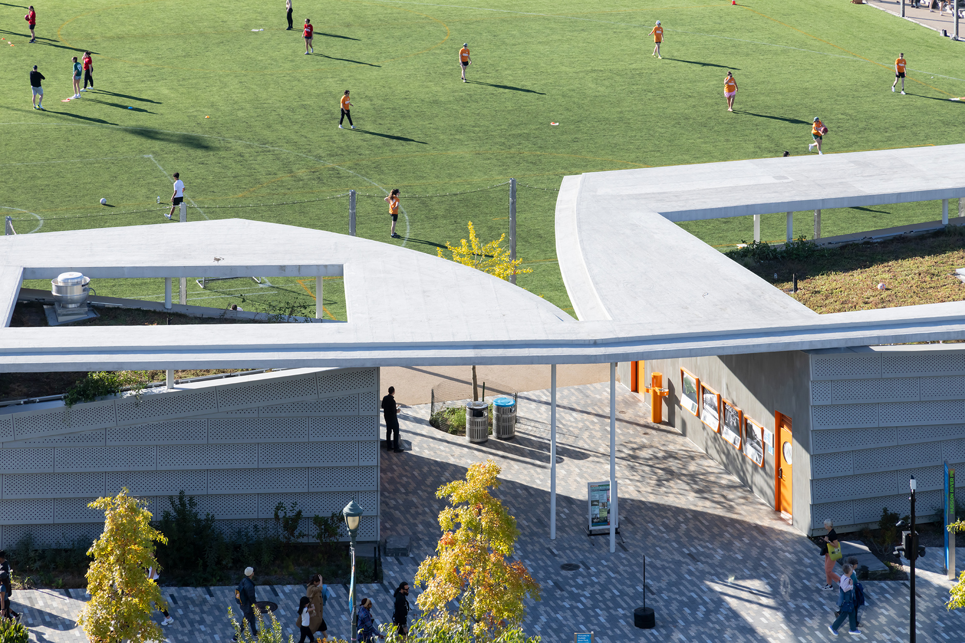 On Manhattan’s newest “beach”, nARCHITECTS has designed a park pavilion for the Henry Hudson River Park Trust. Shifting from its previous mercantile and industrial use, the site has been transformed into the new 5.65-acre Gansevoort Peninsula Park, led by the landscape architect James Corner Field Operations. The park introduces open spaces for the community, including a beach, kayak launch, sports field, and salt march, as well as a boardwalk located on the last remnant of 13th Avenue.