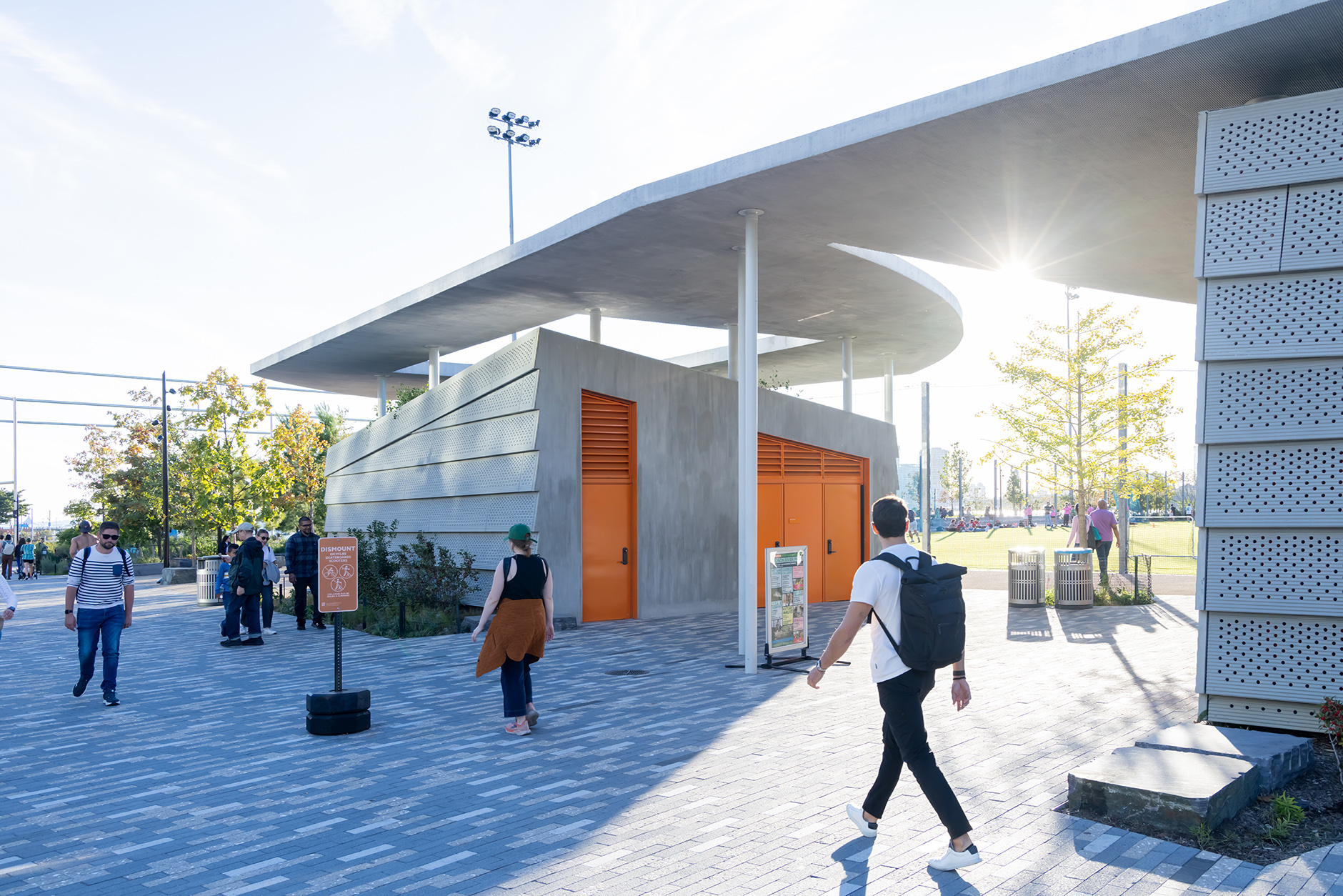 Our park pavilion serves as a gateway between the city and the waterfront. Public amenity and maintenance functions are dispersed across three separate volumes connected by a canopy. Between the volumes and the canopy, a series of portals strategically frame the pedestrian and bike promenade on the east and the park activities to the west.