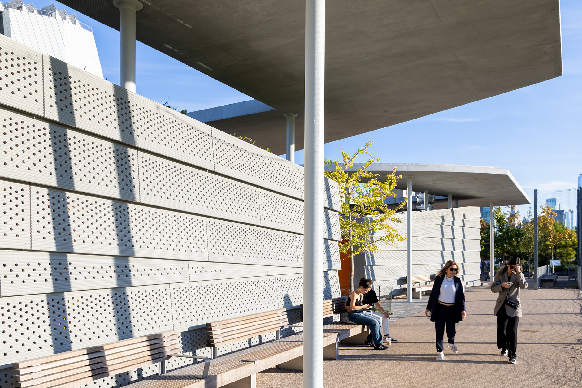 Highly visible from the Whitney Museum’s terraces to the southeast, the pavilion offers a striking new landmark seen from above. The large openings in the canopy evoke the geometric forms and light effects of Gordon Matta Clark’s cuts into a warehouse on the same site for his 1975 installation Day’s End. Green roofs multiply the native plantings on the ground below, broadcasting the new park’s identity to the surrounding towers.