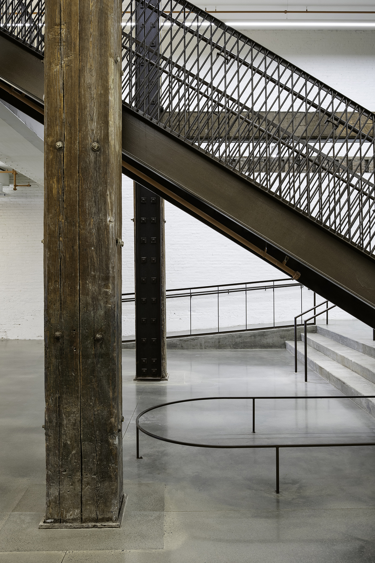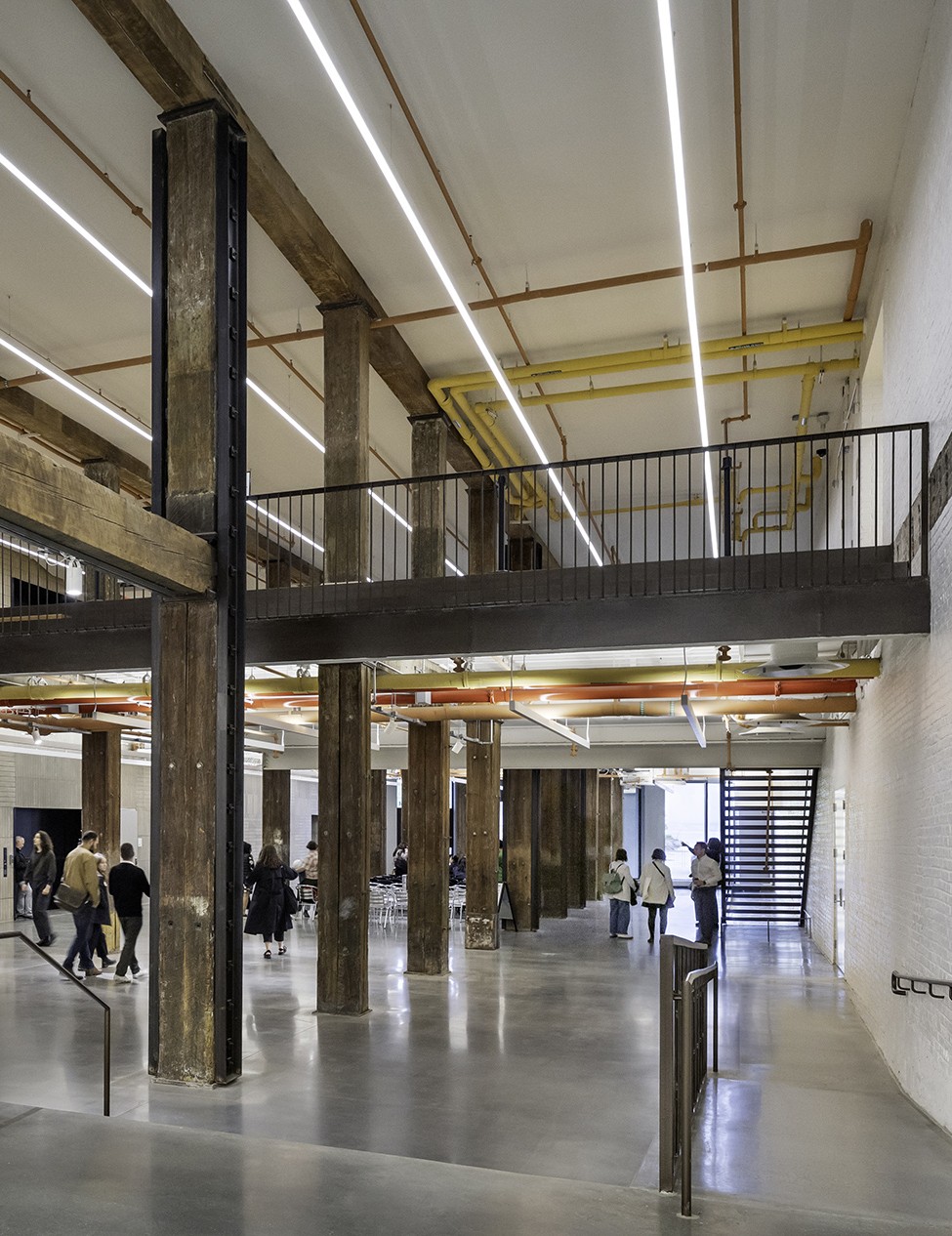 Interior steel railings evoke the textile looms of garment manufacturers and convey an ethos to interweave the new into the old.