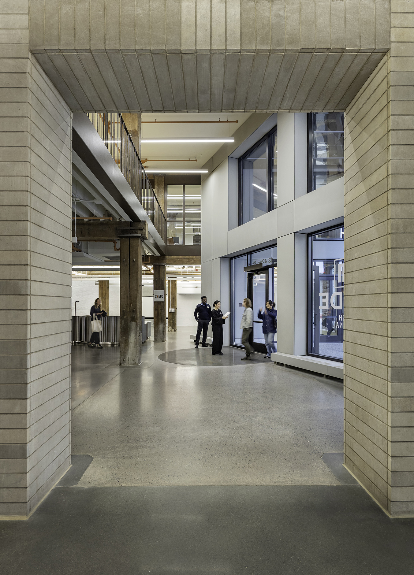Echoing the fire bays that formerly transferred manufacturing goods to waiting ships at port or trains on the rail lines, a generous new ‘interior street’ connects the cityside of the building to the waterfront. From the interior, this through-block lobby is punctured by double-height voids that vertically connect manufacturers and their goods to the street below.