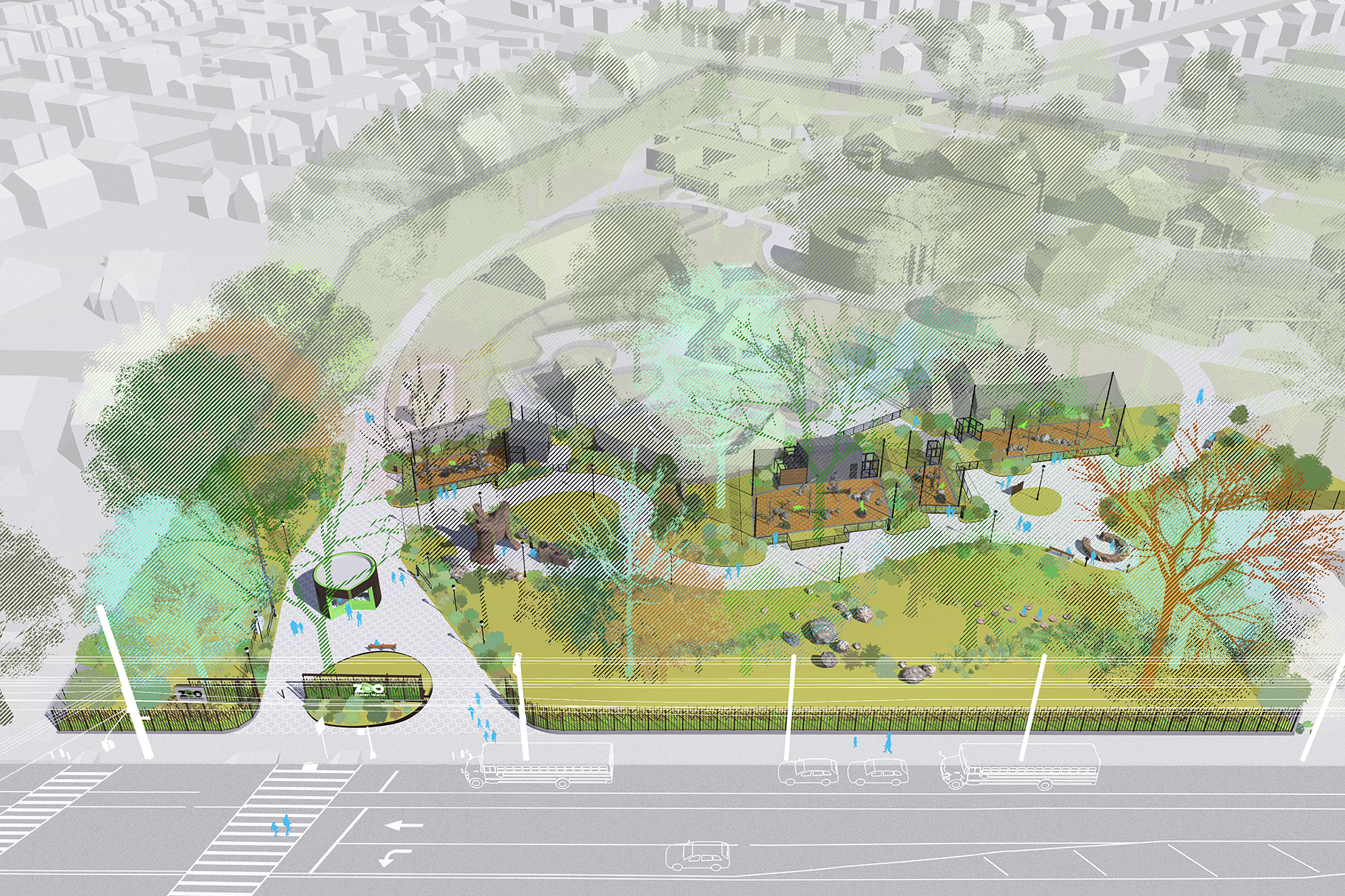 The new entrance along Clove Road welcomes patrons into a landscape of discovery. Conceived as a generous civic gesture, the entry plaza softens the transition from the street to the zoo, guided by a new perimeter ‘tree fence’ inspired by animal crackers. A round, log-like ticketing kiosk serves as an orientation point at the heart of the plaza.